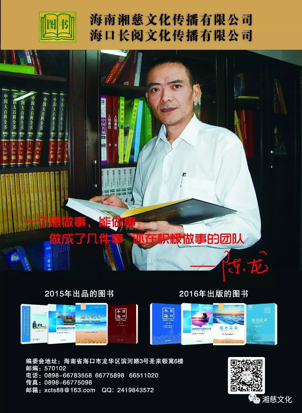 我是海南年度重点出版的人文地理旅游图书《魅力海南》《海南国际旅游岛手册》《今日海口》《海南记录》的出品人/总编【陈龙】、海南湘慈文化传播有限公司/海口长阅文化传播有限公司法定代表人。