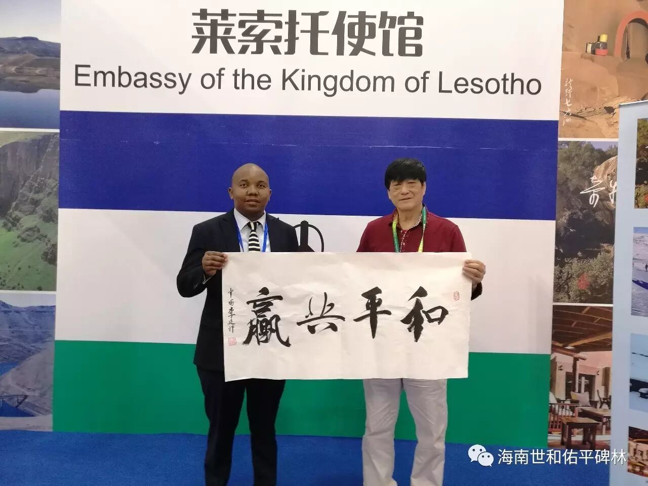 李廷轩用一支笔、一张纸书写“和平共赢”与各国元首总统政要和平互动、文化交流。李廷轩先生在海南休博会的莱索托大使馆与一等秘书莫纳亨先生文化交流,并委托莫纳亨先生务必把“和平共赢”书法转交莱索托总统,让莱索托总统以和平颂词作为回馈刻碑留念。