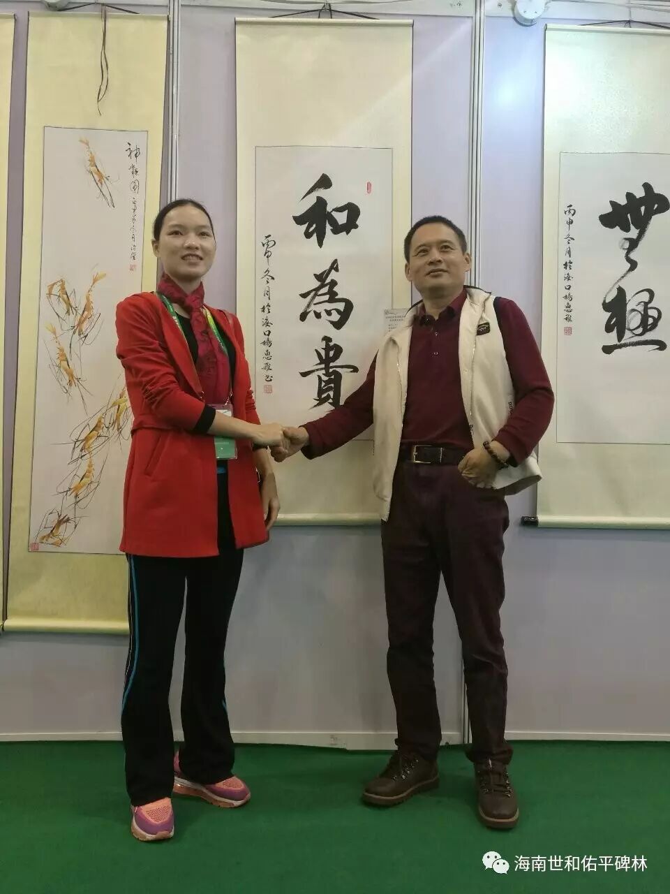 图为海南省医疗救助慈善基金会秘书长范廉君先生与青年书法家杨惠雅女士合影