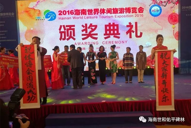 2016海南世界休博会圆满闭幕。在闭幕式颁奖的最后一个节目上,主持人宣布:“现在由著名国际书法家、公益书法家、海南世界和平碑林基金会理事长李廷轩先生向海南世界休闲旅游博览会组委会敬赠‘世界休博会,海南欢乐节’墨宝。”老书法家李廷轩先生和青年书法家杨惠雅女士将李廷轩先生书写的榜书“世界休博会,海南欢乐节”书法敬上舞台,由北京瑞莱森会展服务有限公司董事长杜龙和海南红帆会展服务有限公司的董事长谢国华上台受赠,并合影留念。台下以热烈的掌声拉下海南世界休博会的帷幕。