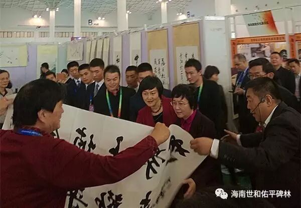 李廷轩的榜书展区格外抢眼。他的八尺横幅:“一带一路盛南海”、四尺中堂“世界游遍、休闲海南”、“休闲海南、沐浴阳光”十分切题。四尺斗方“寿者仁”书法受广大人们的欢迎;许多客户纷纷向李廷轩先生预定书法。